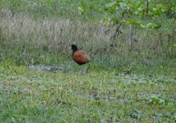 Descripción: Es un ave acuática de tamaño mediano, inconfundible por sus dedos extremadamente largos y uñas desarrolladas, adaptación que le permite desplazarse con facilidad sobre vegetación flotante. El plumaje combina alas y dorso castaños, pecho y cuello negros, y un escudo frontal amarillo brillante que se prolonga sobre la frente. El pico es recto y amarillento, mientras que las patas presentan tonalidades verdosas. Ambos sexos son similares en plumaje, aunque la hembra suele ser de mayor tamaño.