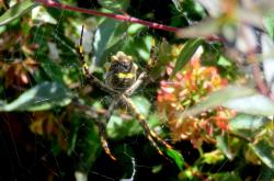 Description: Large and conspicuous spider. Females have a striking silver, yellow, and black coloration.