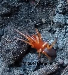 Description: Medium-sized spider. It has an intense red-colored cephalothorax, orange legs, and a whitish abdomen. A notable feature is the large chelicerae, which can be seen with the naked eye. They can produce a painful bite if handled but do not possess venom dangerous to humans.