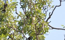 Description: It is a medium-sized parrot with a compact body and a relatively long tail, easily recognized by its distinctive color pattern and lively behavior. The upperparts are bright green, while the forehead, cheeks, throat, and chest display a characteristic pale gray coloration, giving the bird a hooded appearance. The belly is yellowish-green, and the flight feathers show bluish tones. The bill is strong, curved, and pale horn-colored, well suited for a varied diet. Sexual dimorphism is not evident, and juveniles closely resemble adults, though their colors are slightly duller.